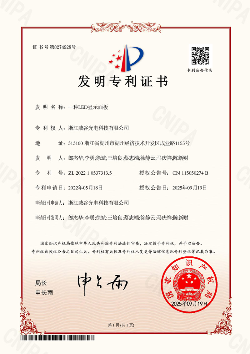 荣誉证书 专利认证 一种LED显示面板 一体式LED显示单元及显示屏 一种用于LED显示屏的前维护锁具 一种用于LED显示屏的插接面板 一种基于LED显示面板的显示屏安装结构 一种单元屏体的单元拼接件 一种LED显示屏显示时的亮度调节系统 一种LED显示面板的显示组件安装结构 一种LED显示面板 KG202224876威谷美国发明证书 一种基于LED显示面板的显示屏安装方法 一种用于显示屏搬运的伸缩把手及显示屏 一种便于维护的显示屏 发明专利证书-2019112271632-一种标准化模条显示屏 发明专利:一种基于LED显示面板的显示屏安装方法 计算机软件著作权证 共 45 条记录 123 >